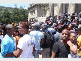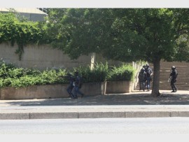 When students congregated on the stairs of the Great Hall, a group of students began pelting stones as the private security guards who were blocking the entrance to Solomon Mahlangu House. Two private security guards threw stones back at the students.
