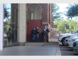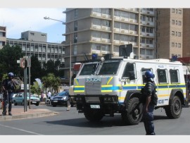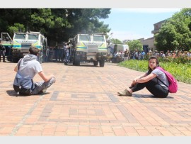 Police, who were camped under a tree, tried to bring in two Nyalas onto the courtyard but were stopped by students who sat in their way, and police then retaliated by throwing the first few stun grenades for the day, one more student was arrested.