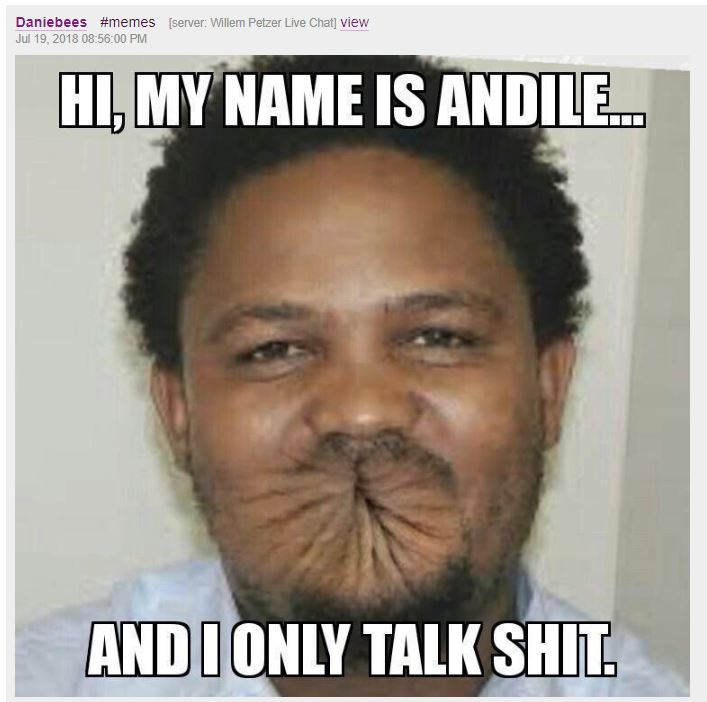 Memes posted by members of the chat are a mix of blatant racism, apartheid nostalgia and even overt Nazi symbolism.