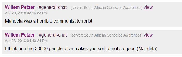 Now a chat group hosted by Petzer, in which Barnard is an active member, has been exposed by Unicorn Riot, a US non-profit media organisation whose Discord Leaks have exposed hundreds of thousands of Discord chats from alt-right and far-right servers, most of which were in the US, but one of which was Petzer’s in South Africa.