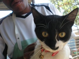 Sabrina is a black, domestic short-haired, female, three years old, unwanted and very loveable.