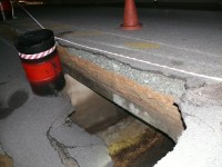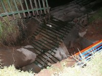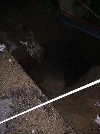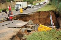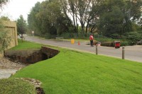 The barricade that used to line the road can now be seen at the bottom of a 10m deep pit. The fence and park that was also next to the road has also disappeared when the surfaced collapsed. According to those on the scene the pit is about 10m across and 10m deep. Cable sleeves can also be seen in the pit, but these appear to still be in tact. The river can be seen to be flowing freely between stacks of tar and concrete.