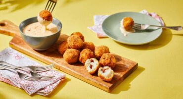 Fried mielie-meal and bean balls with cheese sauce