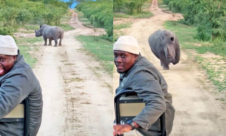 The rhino and elephants’ antics put a smile on Mdluli’s face and drew a few giggles, but this soon changed when the rhino set its sights on the safari vehicle.