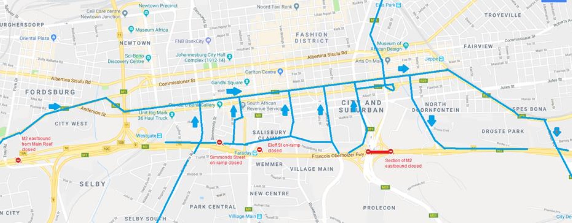 • All vehicles approaching along the M1 from Southgate direction wishing to travel along the M2 eastbound to access the CBD and surrounding areas should rather make use of Booysens Road or Eloff Street. Motorists wishing to access the N3 should rather make use of the N12.