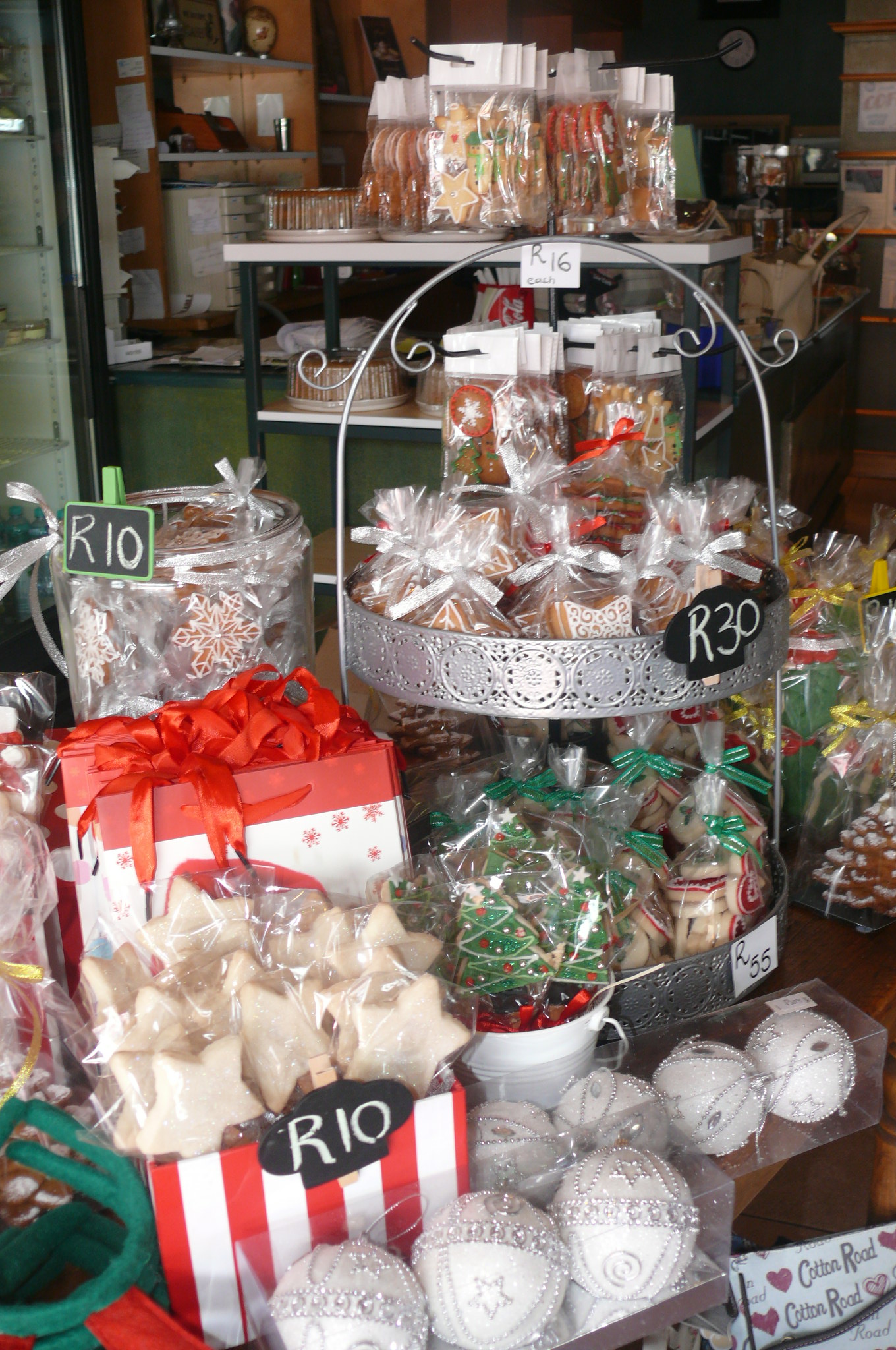 They are selling the most beautifully decorated little Christmas biscuits (angels, stars, Father Christmas’s, snowmen, Christmas trees, snowflakes, etc) in shortbread or gingerbread, which are absolutely delightful. They range in price from R10 upwards and will make gorgeous little gifts for children.