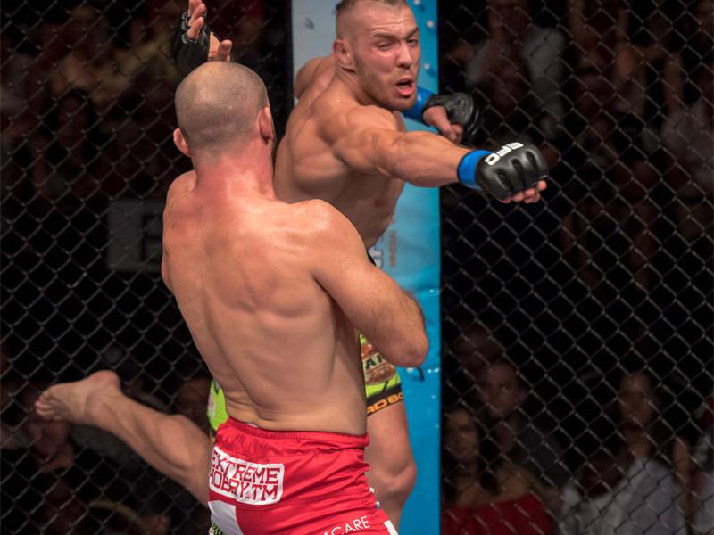 It was in the second round that du Plessis’ legendary stamina took over. Still attacking hard, he defended two deep guillotine attempts before reversing the position on the floor – and sinking a guillotine of his own. Haratyk was bleeding from the elbow, ground and pound. The sold out arena were on their feet as Haratyk tapped, giving du Plessis a massive scalp in a division above his own.