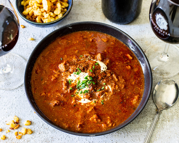 Constantia Glen’s famous Austrian beef goulash soup – a nourishing traditional cold weather foil that’s hearty and rich in flavour – will bowl you over! This spicy beef and potato soup flaunts paprika as its signature ingredient, and it needs a big, well-structured red wine to stand up to its bold flavours. So open a bottle of Constantia’s flagship Constantia Glen FIVE, a blend of five Bordeaux grape varieties, and tuck into this easy-to-make, crowd-pleasing dish, best served with fresh crusty bread to mop up even the last drop in your bowl.