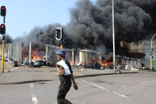 The shacks were burnt down while the occupants were seen scattered, with some settling on the freeway pavement with their belongings.