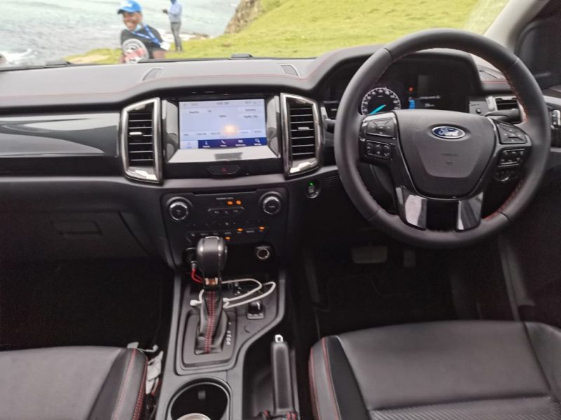Jump inside the cabin and you are greeted by an interior that boasts similar stitching to what lurks in the Thunder and Wildtrak models. The leather seats, dashboard, gear lever and the steering wheel have red stitching.