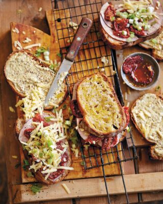 The braaibroodjie is one of the cornerstones of a successful South African braai. There shouldn’t be any argument about the ingredients of the real and original braaibroodjie: pre-sliced white bread, buttered on the outside, with cheese, tomato, onion, chutney, salt and pepper as filling. Naturally though, over time I embarked on a mission to create super luxurious braaibroodjies based on that original recipe. I replaced normal white toaster bread with slices of high-quality artisanal sourdough bread, and swapped chutney for a mixture of French-style mayonnaise and wholegrain mustard. The onion made way for spring onion, and sun-dried tomatoes replaced slices of normal tomato. For cheese the choice shifted to 18-month extra-mature Cheddar. For team spirit I also added gypsy ham but you could also use slices of fried bacon. And forget about butter on the outside – for these creations you go with olive oil instead.