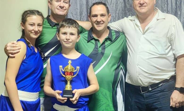 Boxers from Brakpan Boxing Club participated in a "box and dine" showcase on March 29 in Sinoville, Pretoria, hosted by Tuine Tiere Boxing Club. The event was held to raise funds for two churches in the area, and two boxers from Brakpan competed. Talitha Roos lost her match with points, 2-1, and Braam Labuschagne won his match 2-1. The young boxers are seen with coaches Steven Labuschagne, Koos Roos and Jaco Visagie.