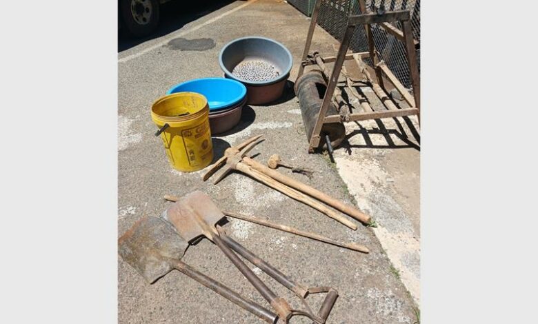 During the operation, two men were arrested and found to be illegal immigrants. Confiscated items include spades, picks, hammers, water pipes, bathtubs, and a small-sized penduka.