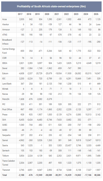 That the SOEs collectively posted a profit of R58 billion for the year to March 2025 is a welcome change. In the previous year, the total loss exceeded R16 billion – and in both 2020 and 2021 it peaked at more than R38 billion.