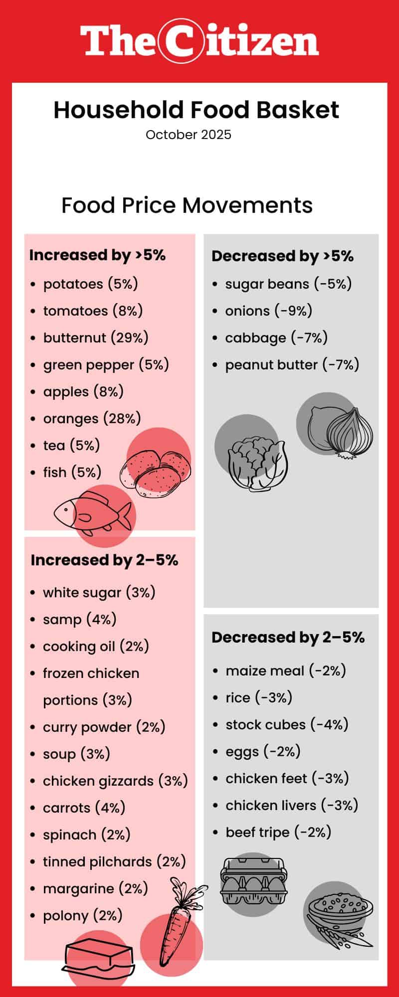 In October, the group found that 26 of the food items in the basket of 44 products increased in price, while 18 cost less. Notable increases were found in the prices of white sugar, frozen chicken portions, tomatoes, butternut and oranges, while onions, sugar beans and maize meal (except in Joburg and Durban) moderated the increases on the basket.