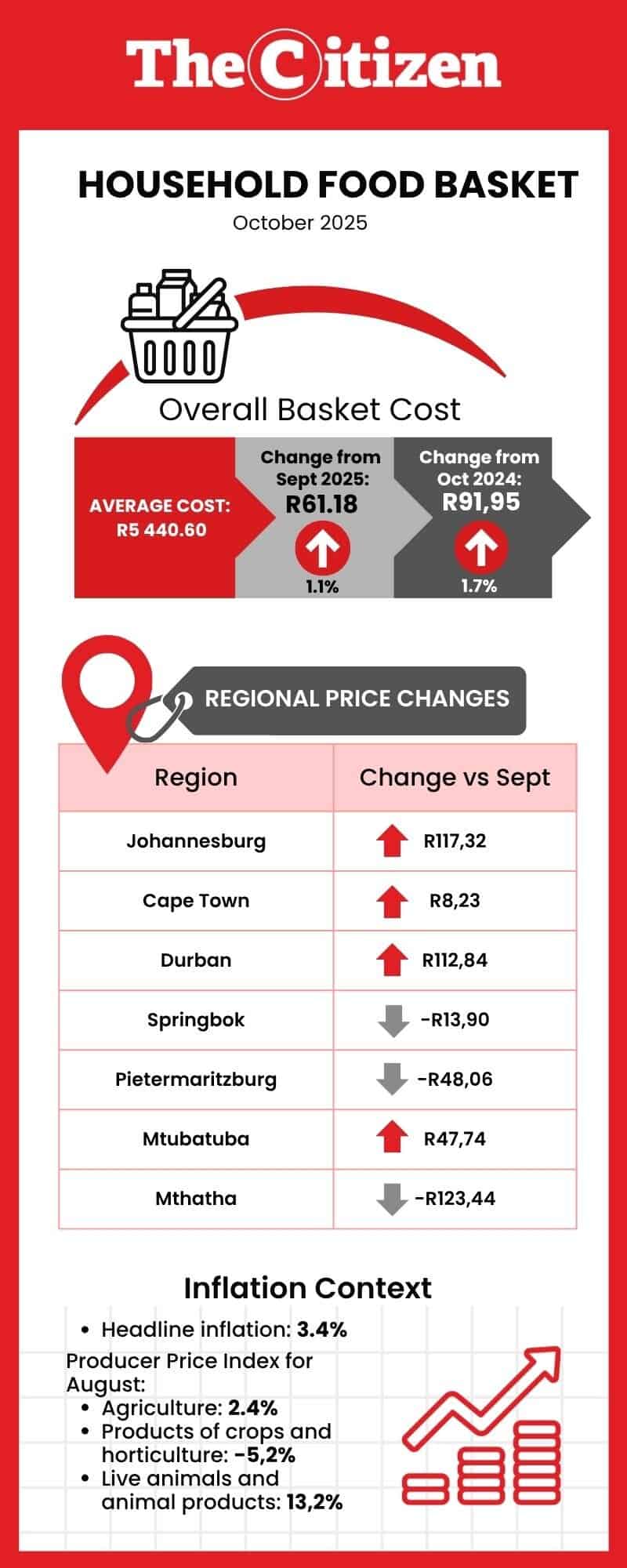 The household food basket survey for October shows that the average cost was R5 440.60, R61.18 (1.1%) more than in September and R91.95 (1.7%) more than in October 2024.