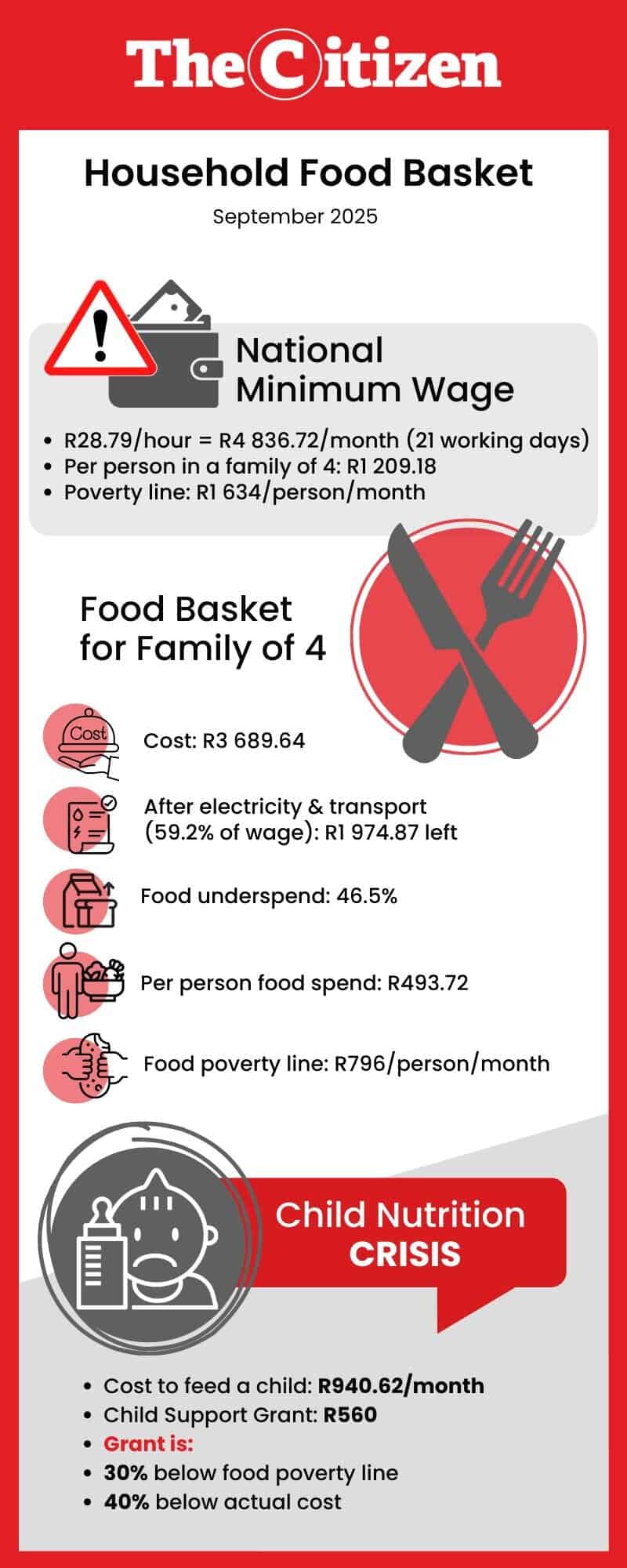 Workers who earn the national minimum wage of R28.79 per hour, R230.32 for an 8-hour day and R4 836.72 for an average 21-day working month, must use their wages to buy food for an average family of four and still pay for everything else, such as electricity and transport.