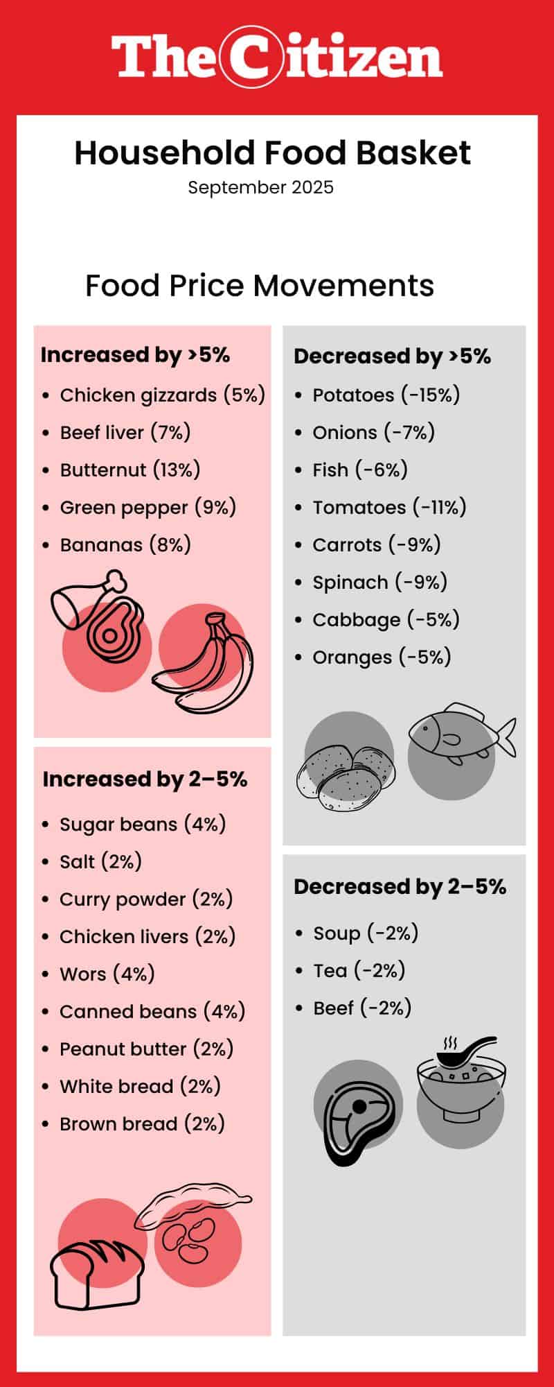 In September, the prices of 21 of the food items in the household food basket increased, while 23 food items cost less. This chart shows the food price movements in September: