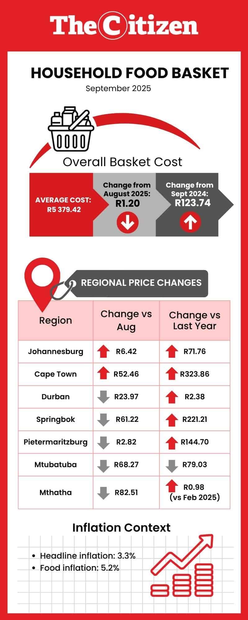 The average price of the household food basket also differs from region to region. In September, only the household food baskets in Johannesburg and Cape Town cost more.