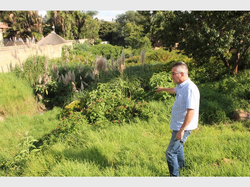 “If we don’t clear the pavements ourselves, nothing gets done. We’ve adopted a park area on the corner of Soutpansberg and Tafelberg drives and planted eight palm trees. We maintain the park and we water the trees ourselves. We’ve also erected a guard house with a stoned parking bay at the side. We’ve asked Crichton if he can assist with acquiring children’s playground equipment. No response! The river, which runs, or I should say barely runs, due to it being completely overgrown with plants and trees is leaking sewage. When asked for help, no response.