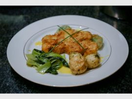 Cauliflower steak, drizzled in a lemon juice, chives, garlic and seasoning dressing, with pak choi and roasted potatoes