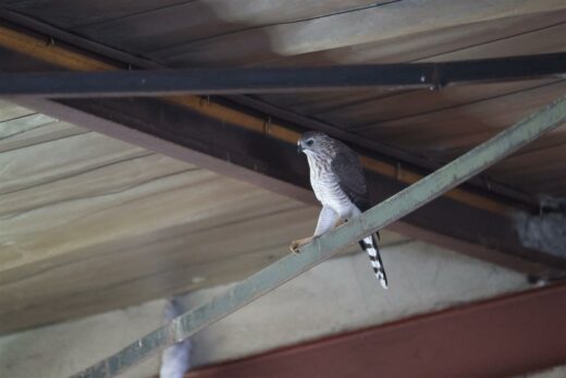 The goshawk perched in the rafters.