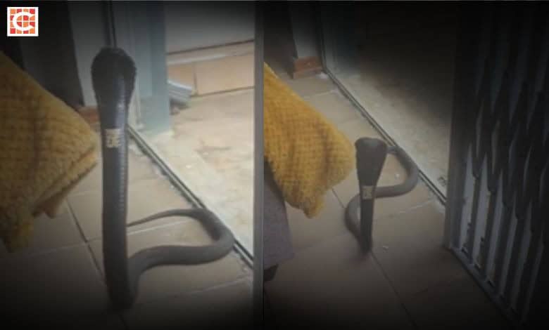 In a Facebook video taken by part-time snake catcher Stephan Fourie, a big rinkhals can be seen standing upright next to a sliding door.
