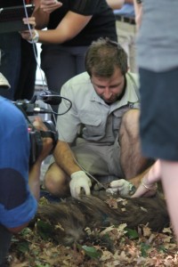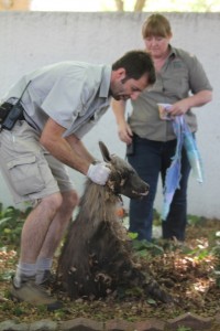 By 9am, Dr Brett Gardner a veterinarian of the Joburg Zoo, and inspectors of the Society for the Prevention of Cruelty to Animals arrived to sedate the animal. Gardner armed with a tranquilizer gun darted the animal. The effects of the sedatives took a few minutes to kick in as the animal once again made a run to the top of the road.