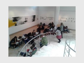 This exhibition also includes her most recent abstract handmade artworks, consisting of paper pulp with numbered and lettered beads. In these artworks, partially hidden words are buried among the lettered beads. “They [art] suggest a frenetic transport environment and taxi inroads into the cities [in Gauteng] from every direction. Movement and simple shapes from the blind language continue to provide the impetus for my resulting contemporary artworks.”
