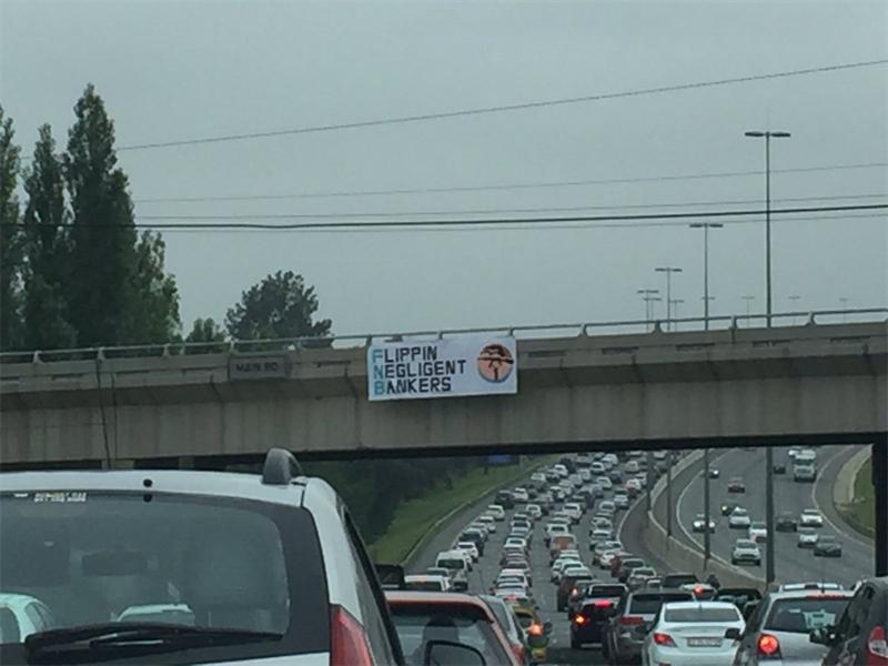 An unidentified person, presumably a disgruntled client, has created a social media buzz after putting up a large banner of the FNB logo on the highway between Fourways and Rivonia, on the Main Road bridge, to share his/her feelings about the bank and its services.