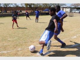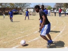 Shadreck Chidakwa from Unity College runs with the ball against the Douglasdale police football team. Photo: Khomotso Makgabutlane