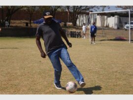 Unity College staff member Phineas Matlou goes to strike the ball forward against the Douglasdale police football team. Photo: Khomotso Makgabutlane