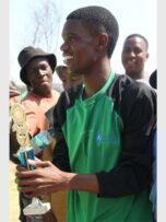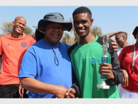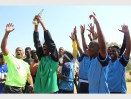 Colonel Moeti Senna of Douglasdale Police Station hands the winners’ trophy to Honeydew police’s goalkeeper Given Ramasobana. Photo: Khomotso MakgabutlaneGertrude Malaka, Mikayla Kaka, Grace Engels and Busisiwe Malate of Unity College celebrate Casual Day. Photo: Khomotso Makgabutlane
