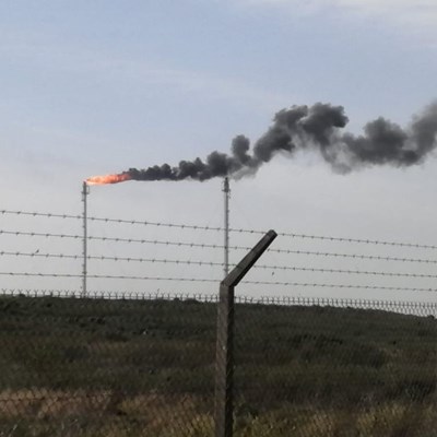 Thick, grey smoke from PetrsoSA flare stack outside Mossel Bay