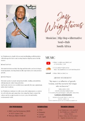 Jay Wrighteous, who has had local performances in Randburg, Sandton, and Fourways, discovered his passion for hip-hop in the heart of Rustenburg’s Chaneng village, amid a backdrop of small-town life and familial influences.