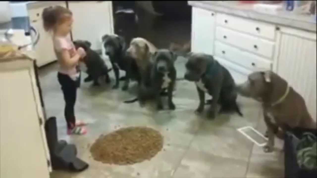 4 year old little girl feeding and controlling 6 pitbulls