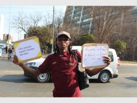Mmakwena Ramushu from Corporate Governance and Traditional Affairs (COGTA), singing and marching in Germiston, in support of Bertha Gxowa Hospital Care Centre’s #Sisonke campaign, against women abuse last Wednesday.