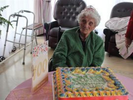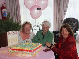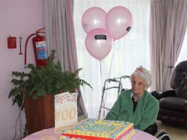 Ruby Wheeler with her light pink birthday balloons, birthday cake and large birthday card that was given to her for her surprise 100th birthday party at Protea Old Age Home, in Primrose last Friday.