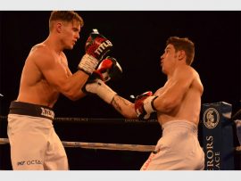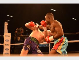 Michael Mokoena and Jabulani Makhense taking each other on in the ring during the KO Kings Box and Dine at Emperors Palace recently. Photo by: Annette van Schalkwyk
