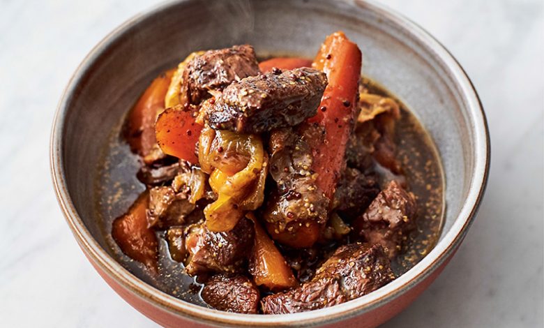 You’ll need: 900g beef shin, bone out (ask your butcher for the bone); 500g carrots; 2 onions, 125ml Worcestershire sauce; 2 heaped tsps wholegrain mustard