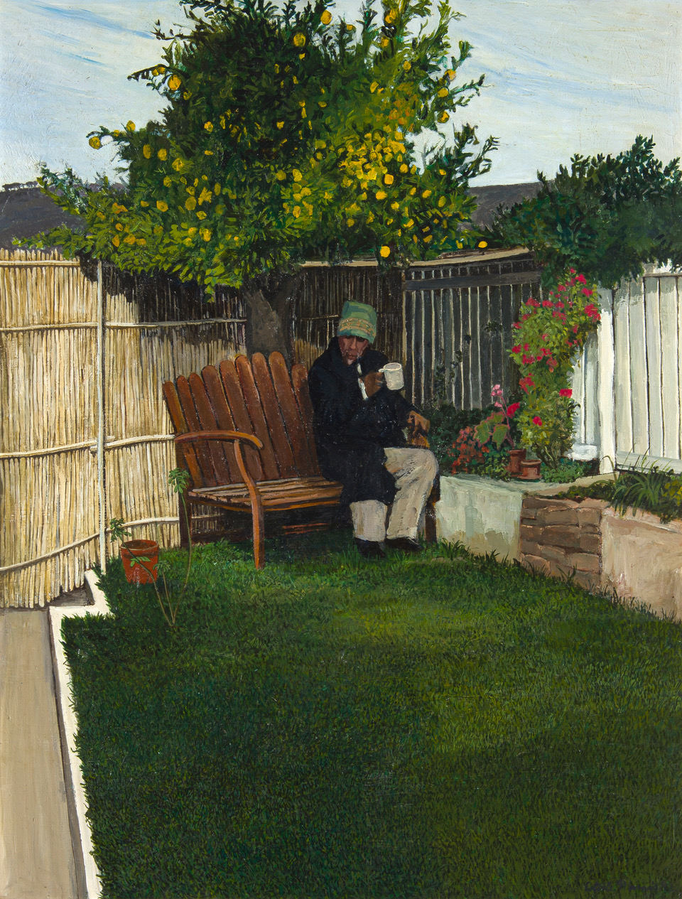In New Brighton two female figures stroll through the streets of the then racially segregated township on Port Elizabeth’s outskirts (today Gqeberha). Despite the tragic history of forced removals by the Apartheid government and issues like poverty and suppression, there is almost a rural idyll to this watercolour by Pemba.