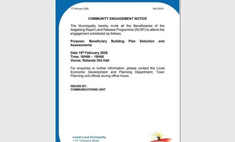 Lesedi Local Municipality has called on beneficiaries of the Ikageleng Rapid Land Release Programme to attend an upcoming community engagement event to advance the housing development process.