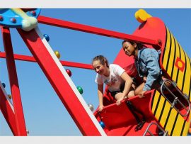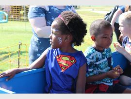 Sibulele (8) and Kea (6) Redman enjoying a ride on the train which wound through the other attractions on the field at the Thomas More Country Fair on Saturday, 27 July. PHOTOS: Evelyn Morris