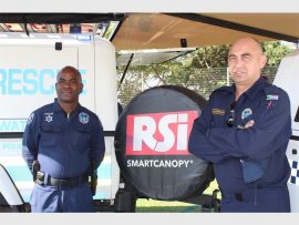 Keeping a serious eye on proceedings at the country fair while displaying some of the tools of their work were Cst Fana Dlamini of Metro Search and Rescue and W/O Koos van der Merwe of SAPS Search and Rescue. PHOTOS: Evelyn Morris