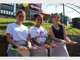 Servers-in-waiting: Grade 10 learners from Thomas More College, Jessica Mills (16), Kirsty Canham (15) and Kathleen Young (15) took a moment from serving tea to pose for a picture. PHOTOS: Evelyn Morris