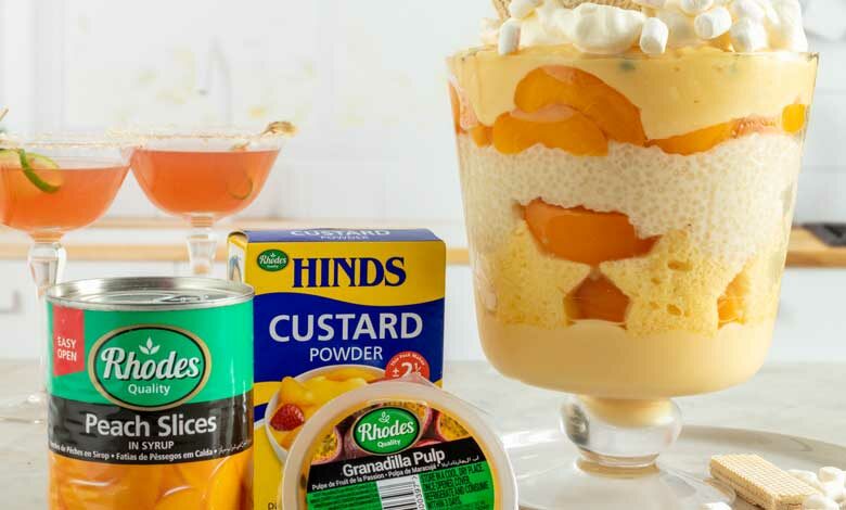 ● 115 g cup Rhodes Quality Granadilla Pulp ● 90 ml (6 Tbsp) Hinds Vanilla Custard Powder ● 90 ml (6 Tbsp) Sugar ● 1 lt (4 cups) Milk, divided ● 1 ready-made vanilla sponge cake ● 250 ml (1 C) sago ● 1 lt (4 C) 4 milk ● 125 ml (½ cup) sugar ● 5 ml (1 tsp) vanilla essence ● 30 ml (2 T) butter, softened ● 500 ml (2 cups) cream, whipped to soft peaks |