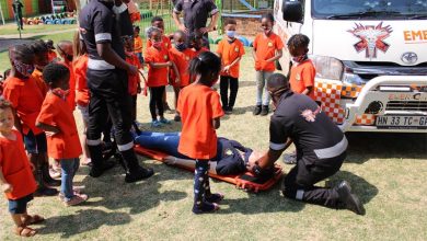 Local newsJP Clelland and Jaco Jooste from Sec Pros also demonstrated the stop-drop-and-roll fire safety technique to the children.