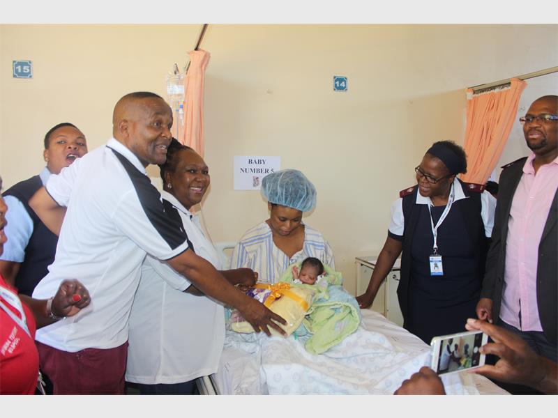 The first baby was welcomed with a set of gifts brought in by Ekurhuleni district officials Mlungisi Phakathi, Thembeni Masina and Lindiwe Maduna, who were joined by Wilfred Mothwane, a nursing manager at the hospital.