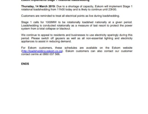 Eskom to implement stage 1 load shedding from 11am to 11pm Thursday, March 14, due to a shortage of generating capacity.