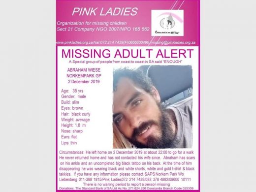 Anyone with information about his whereabouts is urged to contact W/O Liebenberg on 011 398 1815 or the Pink Ladies 072 214 7439.